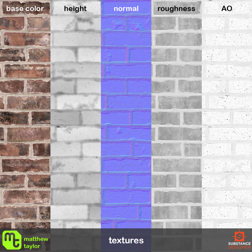 100% procedurally generated material made in Substance Designer. Standard modern bricks with some minor damage. This material includes a number of parameters for customising the look of the material. Most notably you can change the number and size ratio of the bricks, control the random rotation of the bricks and increase/decrease the thickness of the grout. You can also add variation to the height output. More details and examples can be found here.