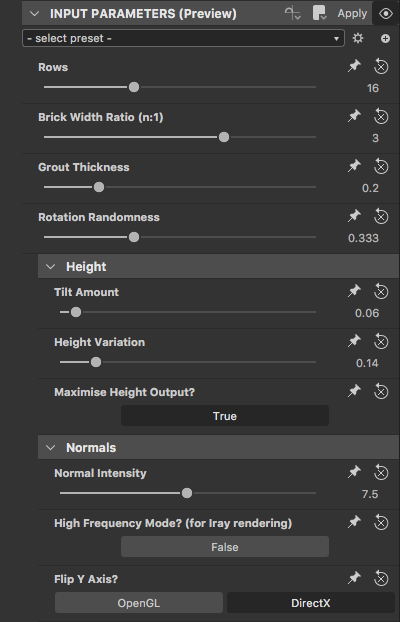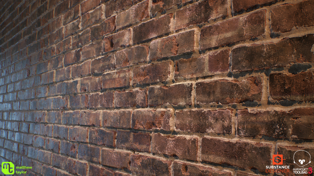 100% procedurally generated material made in Substance Designer. Standard modern bricks with some minor damage. This material includes a number of parameters for customising the look of the material. Most notably you can change the number and size ratio of the bricks, control the random rotation of the bricks and increase/decrease the thickness of the grout. You can also add variation to the height output. More details and examples can be found here.