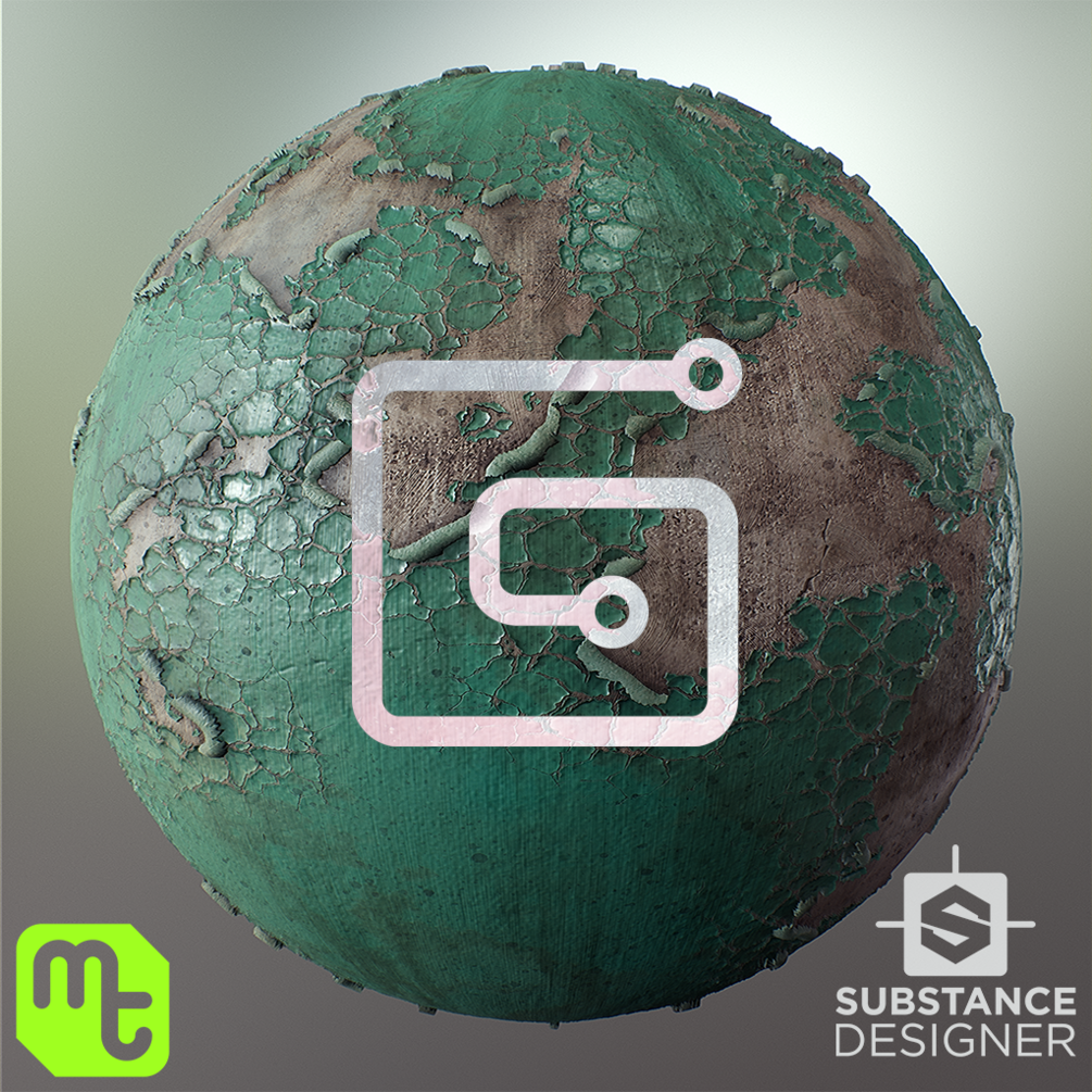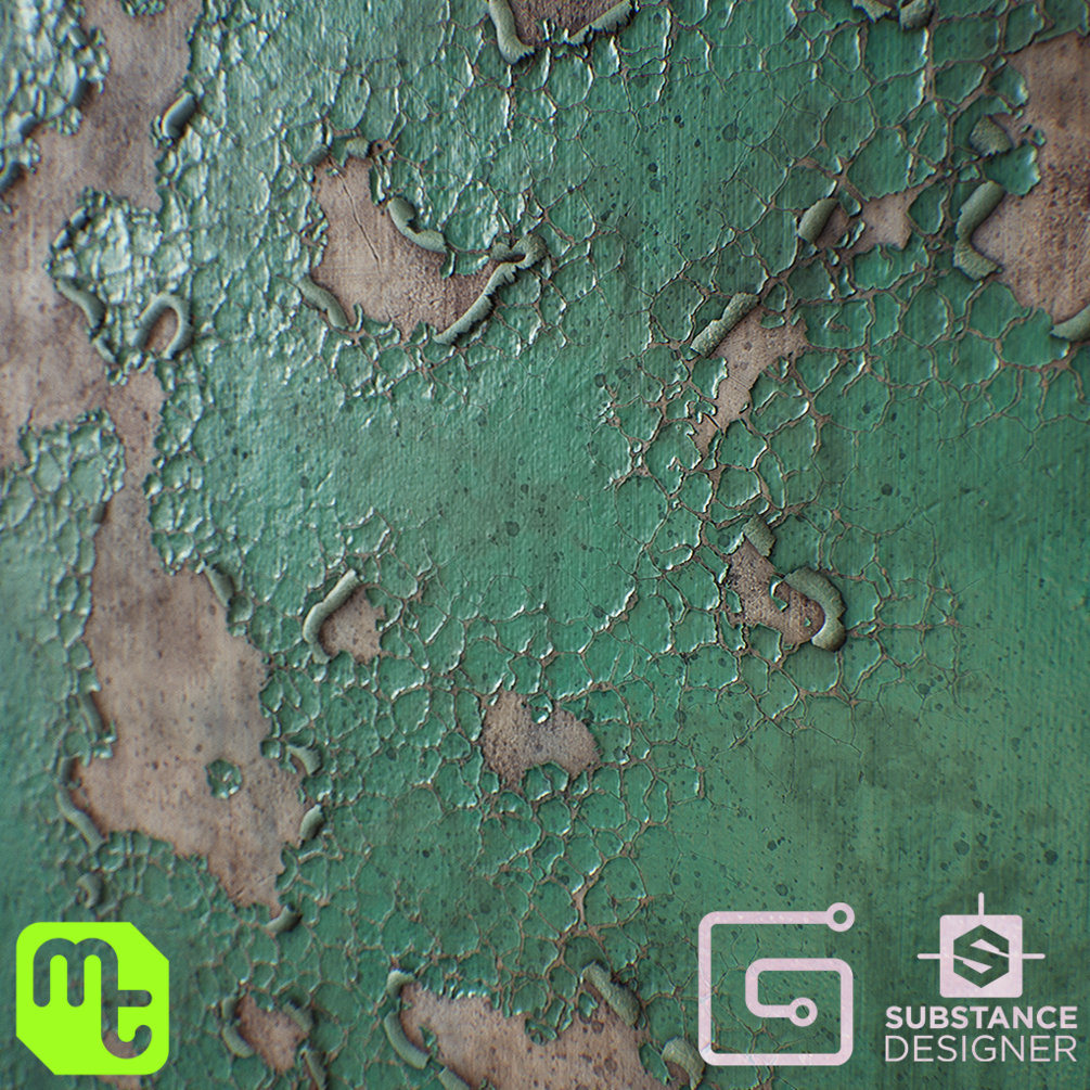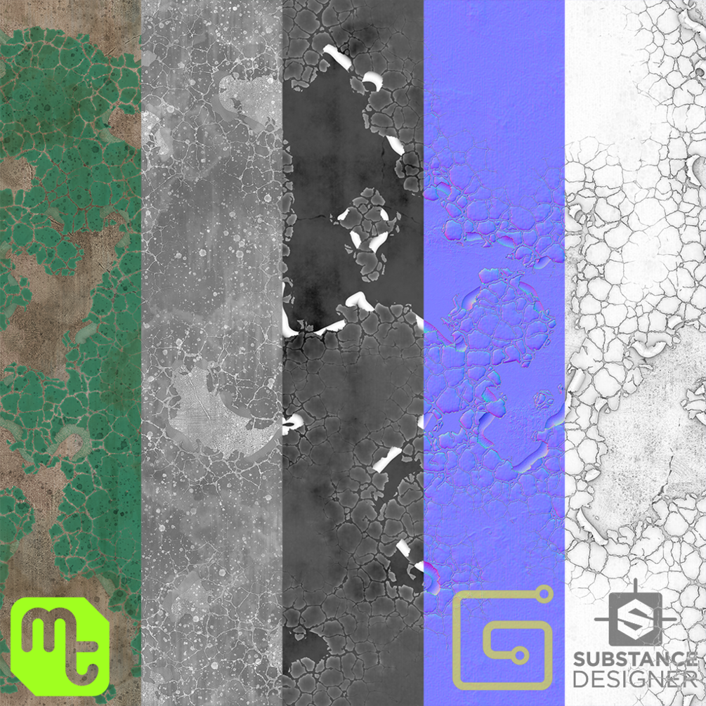100% procedurally generated material made in Substance Designer. The material is dynamic and simulates the cracking and peeling of a painted wall. The controls are simplified down to a 'decay' slider and some settings for changing the paint colour, roughness and normal intensity/format. More details and examples can be found here.