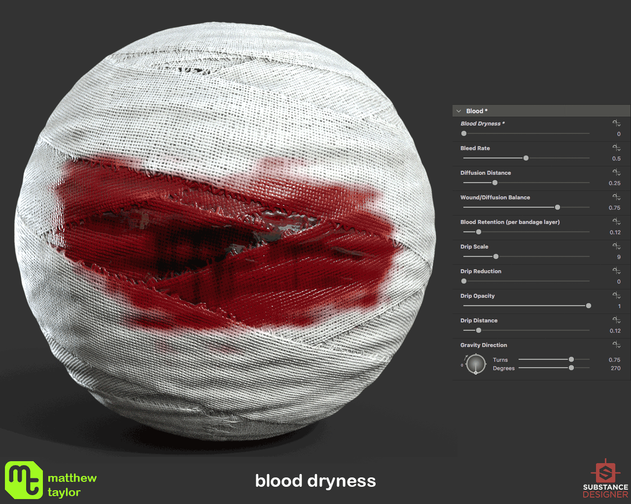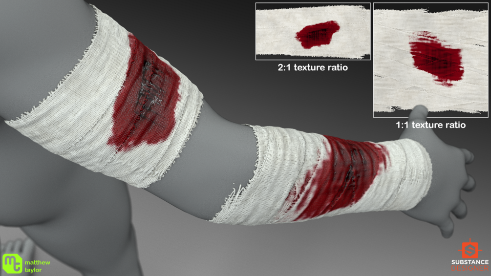 100% procedurally generated material made in Substance Designer. This material can be used to quickly generate bandages with a high degree of customisability. Can be easily mapped to any 'cylinder-like' geometry that is unwrapped to fit the 0-1 UV range. Could be very useful to character artists. More details and examples can be found here.
