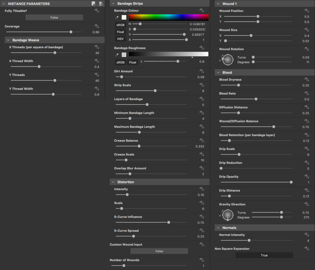 100% procedurally generated material made in Substance Designer. This material can be used to quickly generate bandages with a high degree of customisability. Can be easily mapped to any 'cylinder-like' geometry that is unwrapped to fit the 0-1 UV range. Could be very useful to character artists. More details and examples can be found here.