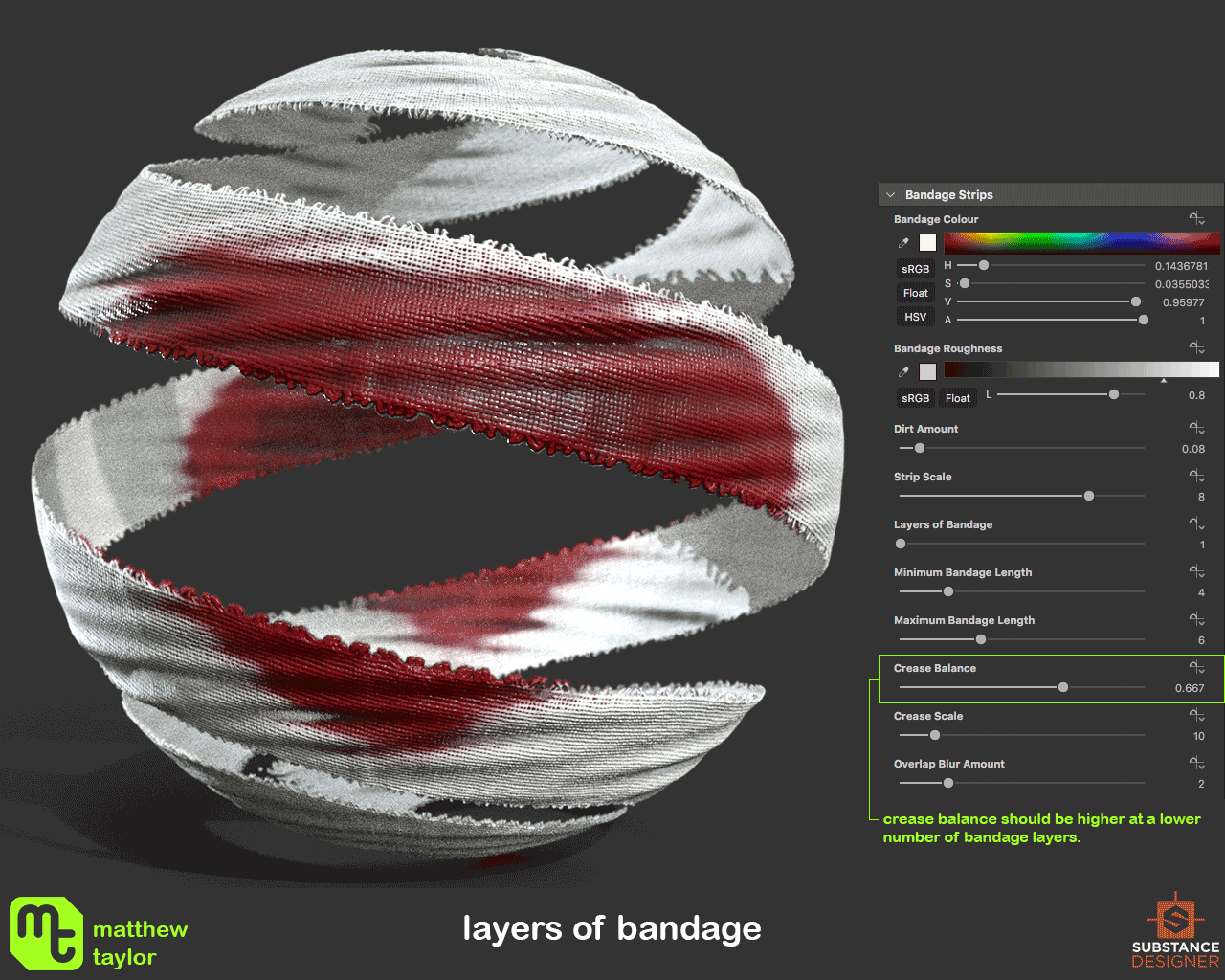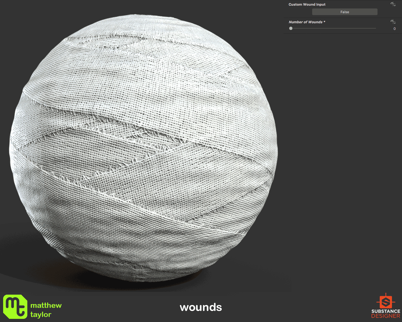 100% procedurally generated material made in Substance Designer. This material can be used to quickly generate bandages with a high degree of customisability. Can be easily mapped to any 'cylinder-like' geometry that is unwrapped to fit the 0-1 UV range. Could be very useful to character artists. More details and examples can be found here.